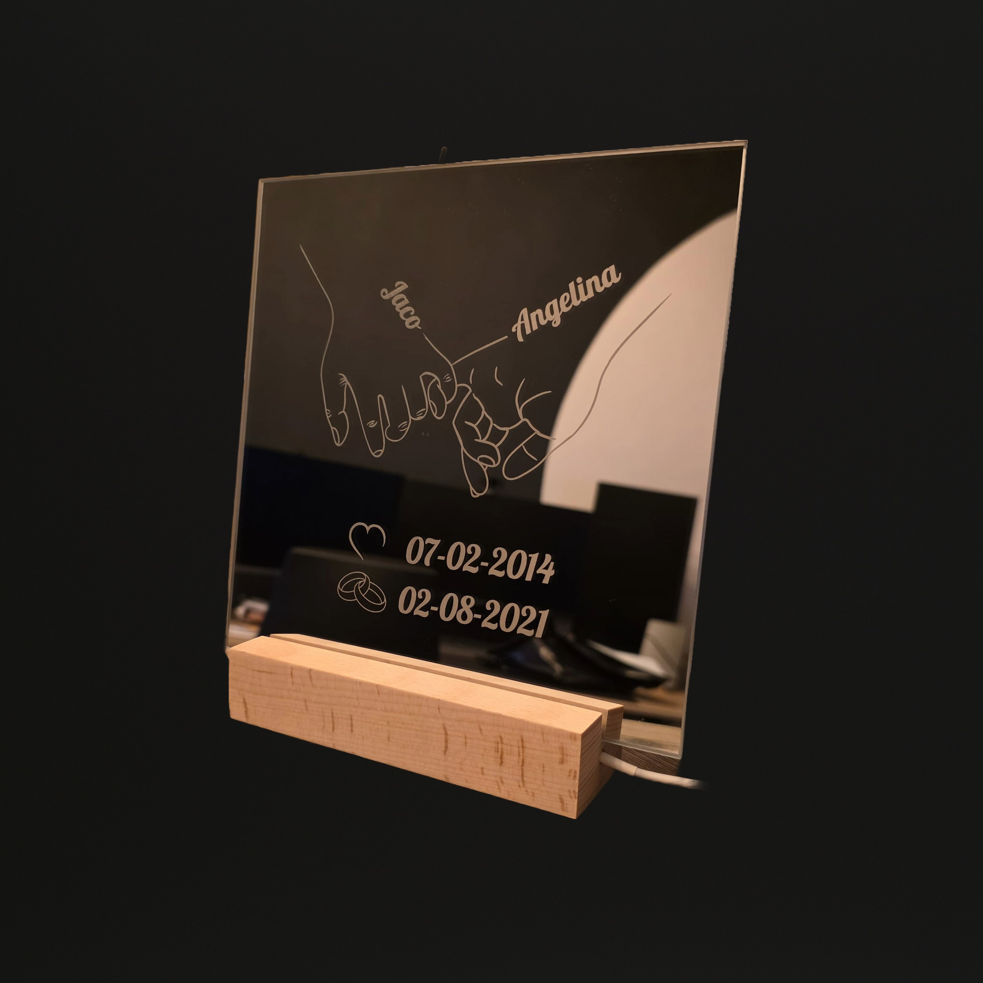 Houten standaard voor spiegel met led verlichting.